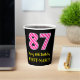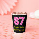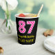 Ce joyeux autocollant carré à thème d'anniversaire comporte un grand numéro "87" avec un motif rose clair et rose foncé rayures, avec le message "Happy 87th Birthday," et un nom modifiable. L'arrière - plan est noir de couleur. Des tasses de papier gaies comme celle-ci peuvent être amusantes à utiliser lors d’une fête d’anniversaire en l’honneur du 87e anniversaire de quelqu’un. [~Z0000580]