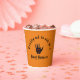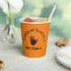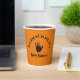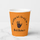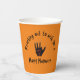 Attention à ne pas effrayer vos invités avec ces tasses de papier Halloween effrayantes. Une main morte s'approche pour vous souhaiter une Happy Halloween. Coupes orange avec une main scintillante et décomposée et des lettres en détresse. Boo !