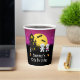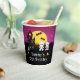 Cette tasse en papier amusante et éffrayante présente de mignonnes momies à côté d'une maison hantée tordue. Dans l'arrière - plan est une pleine lune avec des chauves-souris et un ciel rose de nuit avec des étoiles. C'est parfait pour Halloween.