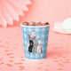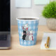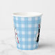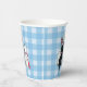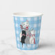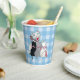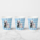 Ces tasses en papier sont des motifs plaid bleu et blanc avec une chatte mère blanche heureuse assise avec ses trois petits chatons noirs, gris et blancs, tous portant des arcs roses sur le cou.