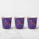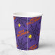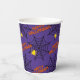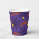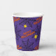 Décorez vos fêtes d'Halloween avec ces tasses en papier cool. Le design comprend des araignées et des toiles d'araignée sur un arrière - plan violet. Orange Happy Halloween texte.