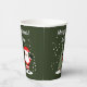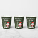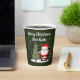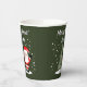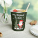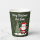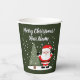 Happy Santa Claus cartoon with Christmas tree Paper Cups. Cute Holiday design for friends and family. Personalized cups for parents and children. Funny joyful illustration with for the winter season. Add your own name and custom seasons greetings like Merry Christmas or Happy Holidays. Customizable background color.