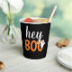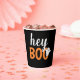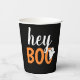 Moderne et mignon "Hey Boo" Halloween tasses de fête papier design caractéristiques texte en orange et blanc avec un petit accent fantôme.
