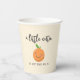 Coupe en papier baby shower à thème Cute Little Cutie illustrant une clémentine avec un sourire. Le texte dit "un peu mignon est en route." Conception neutre pour le genre.