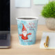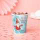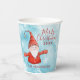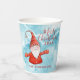 Créez des tasses de papier de Noël personnalisées uniques pour votre fête de famille avec un design élégant qui comprend un joyeux dicton de Noël, un gnome joyeux en rouge et des modèles textuels pour l'année et le nom de famille. Ces tasses en papier bleu clair et rouge avec motif enneigé sont parfaites pour les vacances d'hiver.