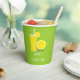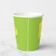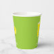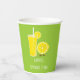 Tasses en papier de limonade avec un nom personnalisable. Ces tasses présentent un citron souriant avec un grand verre de limonade sur un arrière - plan vert.