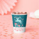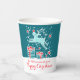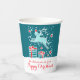 Personnalisez ces tasses de papier de Noël festives avec votre propre nom. Fun Noël turquoise, aqua, rouge vif et blanc design d'un renne avec un nez rouge qui danse sur des cadeaux de Noël en boîte avec des étoiles. Idéal pour des fêtes de Noël faciles avec la famille, les amis ou les clients. © Art original et design graphique par Sarah Trett pour www.mylittleeden.com sur Zazzle.
