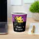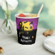 Cette tasse en papier amusante et éffrayante comporte une jolie sorcière à côté d'une maison hantée et tordue. Dans l'arrière - plan est une pleine lune avec des chauves-souris et un ciel de nuit violet avec des étoiles. C'est parfait pour Halloween.