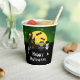 Cette tasse en papier amusante et éffrayante présente de mignons monstres Frankenstein à côté d'une maison hantée. Dans l'arrière - plan est une pleine lune avec des chauves-souris et un ciel de nuit vert avec des étoiles. C'est parfait pour Halloween.