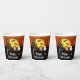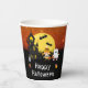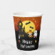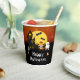 Cette tasse en papier amusante et éffrayante comporte une mignonne sorcière et un fantôme à côté d'une maison hantée. Dans l'arrière - plan est une pleine lune avec des chauves-souris et un ciel de nuit orange avec des étoiles. C'est parfait pour Halloween.
