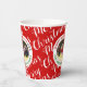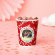 Joyeux script de Noël typographie et photo rouge tasse de papier de vacances. Il présente le texte : "Joyeux Noël" en typographie script et une photo de famille dans un cercle sur le devant et le dos.