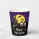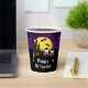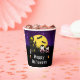 Cette tasse en papier amusante et éffrayante présente de mignons vampires à côté d'une maison hantée tordue. Dans l'arrière - plan est une pleine lune avec des chauves-souris et un ciel de nuit violet avec des étoiles. C'est parfait pour Halloween.