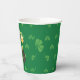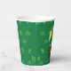 Tasses en papier avec l'illustration d'un leprechaun souriant portant un costume vert, une cravate en arc et un casquette de bowler assis à l'intérieur d'une casserole d'or et tenant une pinte de bière, avec arc-en-ciel jaune, vert et orange dans l'arrière - plan. L'image est placée sur un arrière - plan vert foncé transparent avec des shamrocks. Un design parfait pour célébrer la Saint Patrick !