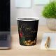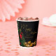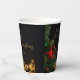 Ces somptueuses tasses en papier Joyeux Noël sont ornées d'une écriture manuscrite dorée moderne sur des lumières scintillantes à côté d'un arbre de Noël festif décoré d'ornements rouges et verts. Customisez cet élégant décor de fête de vacances avec script personnalisé sur le ciel noir de nuit.