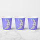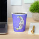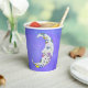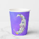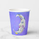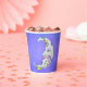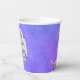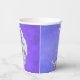 Ces tasses en papier ont une lune mystique de croissant blanc avec un visage. La lune a des lèvres roses et des yeux bleus et des marques abstraites colorées en violet, jaune et bleu sur un arrière - plan de ciel violet.