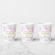 Tasses en papier personnalisées pour mariage d'hiver avec flocons de neige rose et violet. Comprend une belle police de caractères script en or faux et conception de texte pailleté. Avoir un thème de mariage d'hiver est parfait si c'est autour de décembre ou en hiver. Étiquettes de faveur de mariage mignonnes et féminines. Illustration numérique par Kristine Lee. Pour plus, visitez www.kristineleedesigns.com