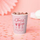 À boire ! Trinquez à la future mariée avec des tasses personnalisées adorables qui incluent son nom et la date de l'événement. Le design est des illustrations fantaisistes rouges de cocktails, de gribouillis de cœur et de « Cheers » dans un script amusant sur un fond rose. © Kimbellished, LLC