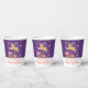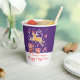 Personnalisez ces tasses de papier de Noël festives avec votre propre nom. Amusant Noël bleu violet, rouge vif, jaune doré chaud et blanc design d'un renne avec un nez rouge qui danse sur des cadeaux de Noël encadrés d'étoiles. Idéal pour des fêtes de Noël faciles avec la famille, les amis ou les clients. © Art original et design graphique par Sarah Trett pour www.mylittleeden.com sur Zazzle.