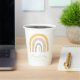 Des tasses en papier pour fêtes arc-en-ciel personnalisées pour l'anniversaire d'une petite fille avec un arc-en-ciel moderne en rose pastel et turquoise, avec un pop de jaune moutarde, avec son âge au centre et son nom au fond.