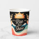 Illustration audacieuse et encourageante, avec un lever de soleil radieux sur des montagnes stylisées dans les tons bleu et blanc. Les rayons dorés du soleil s’étendent vers l’extérieur, flanqués de feuilles abstraits qui encadrent la scène avec chaleur et vitalité. Le premier plan coule avec des motifs ondulés en rouge, rose et crème, ajoutant une énergie dynamique à la composition. Centré sur une typographie élégante, l'expression "Rise and Shine" renforce le thème de la positivité et du renouveau - parfait pour inspirer un bon début de journée.