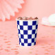 Un motif de damier bleu foncé et blanc classique apparaît sur ces tasses en papier.