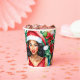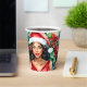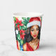 L'oeuvre d'aquarelle présente une belle femme à la peau brune portant un chapeau de Père Noël et une robe rouge contre un arrière - plan poinsettia. Idéal pour la saison des fêtes ! Montrez votre esprit de Noël avec ce magnifique graphisme Père Noël de femme noire.