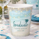 Les tasses en papier de soirée sur le thème de la plage rustique sont agrémentées d'une jolie scène de plage pastel avec des vagues bleues d'aqua qui roulent sur le rivage, encadrées de bois patiné rustique, et décorées sur le dessus de lampes à cordes. Le mot "Graduate" est surmonté d'un casquette diplômé, et le nom et l'année de classe des diplômés sont en dessous.