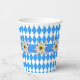 Tasses en papier de l'Oktoberfest faites dans le traditionnel motif à carreaux bleu et blanc de l'Oktoberfest, avec des graphiques des fleurs alpines blanches appelées Edelweiss, courant à travers le milieu.