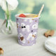 De mignons chiens de bichon frisent en pull et arcs avec des os de chien éparpillés et des empreintes de pattes sur un arrière - plan violet clair.