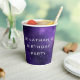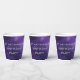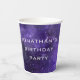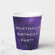 Serve drinks in style with these personalized galaxy birthday paper cups featuring a deep purple cosmic space background with stars and nebulae and modern futuristic lettering. Perfect for a space themed birthday party, planetarium celebration, astronomy party, or science and STEM themed kids birthday. These disposable paper cups are ideal for creating a complete outer space party table setting for boys or girls.