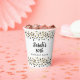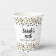 Elégante parties scintillant de confettis noir et or sur une tasse de papier blanc 80ème anniversaire. Personnalisée avec le nom de l'invitée d'honneur et son âge.