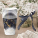 Un arrière - plan abstrait qui évoque le marbre dans les tons bleu marine veiné d'or brillant est la toile de fond de textes élégants et de mises en page design moderne dans les pièces de cette belle suite mariage. La tasse en papier mariage montrée ici contient le texte de script courant ci-dessus plus optionnel de 'Love & Thanks' et un modèle pour ajouter les noms de la mariée et du marié et la date du mariage. Recherchez ID644 pour voir toutes les pièces de coordination de cet ensemble.