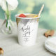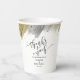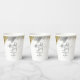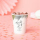 Les pièces de cette belle suite mariage sont décorées de touches de peinture à l'aquarelle modernes surlignées de poussière de parties scintillant dans une palette classique de couleur or et charbon de bois avec un arrière - plan blanc qui peut facilement être changé selon vos préférences. La tasse en papier mariage montrée ici présente le texte plus fluide du script ci-dessus "merci beaucoup" et un modèle pour ajouter facilement les noms des célébrants. Cherchez ID585 pour voir toutes les pièces correspondantes dans ce bel ensemble de mariages.