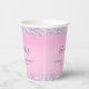 Jolie, glamour et douce fille 16 ans tasses de papier de fête avec holographe brillant violet, rose et argent faux parties scintillant confetti frise contre un arrière - plan rose et son nom dans un script gris doux tendance.