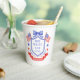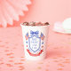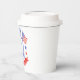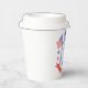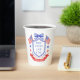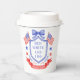 This patriotic bridal shower paper cups features a watercolor crest with a light red white and blue patriotic crest with American flags and a blue bow. Text in the center of the crest says "Red, white and I do." You can personalize with your event date.