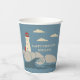 Ajoutez une touche balnéaire aux fêtes de plage et autres événements spéciaux avec ces tasses personnalisées en papier. Ils ont une simple illustration nautique d'un phare en rouge, crème ou ivoire. Le phare se dresse sur une côte rocheuse avec des vagues qui s'écrasent en contrebas et des nuages crème dans le ciel. Le graphique est positionné contre un arrière - plan bleu français doux.