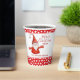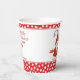 Créez des tasses de papier de Noël personnalisées uniques pour votre fête de Noël avec un design qui comprend un joyeux dicton de Noël, des modèles de texte pour l'année et votre nom de famille, une jolie illustration de gnome et un motif pois blanc et rouge.