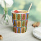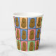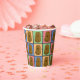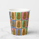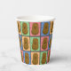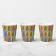 Fun tasses en papier coloré style tapis de souris avec un motif de différents rectangles colorés chacun avec une pomme de terre brune joyeuse au milieu.