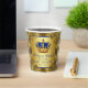 Gobelets en papier pour baby shower prince avec une couronne royale bleue et or sur un fond doré tourbillonnant magnifique. Vous pouvez ajouter le texte de votre choix à ces gobelets en papier bleus royaux et or pour baby shower prince.
