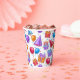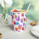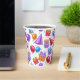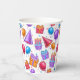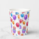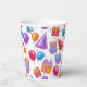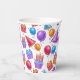 Un motif coloré de gobelets en papier pour célébration d'anniversaire avec des chapeaux de fête, des ballons et des cupcakes