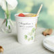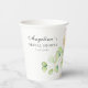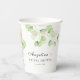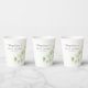 Gobelets en papier pour une baby shower dans un style doux, élégant et minimaliste, décorés de branches avec des feuilles vertes et des verres.