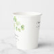 Gobelets en papier pour une fête de mariage dans un style doux, élégant et minimaliste, décorés de branches avec des feuilles vertes et des verres.