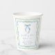 Élégantes coupelles en papier pour douche de mariage avec des cadres à motif floral bleu et à motif vert en forme de coquille vintage grandmillénaire, un noeud papillon coquette bleu capricieux en aquarelle, "quelque chose de bleu avant de le faire" mis en valeur dans une élégante écriture calligraphique bleue, et le nom de la mariée et la date de la douche en typographie serif classique.