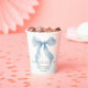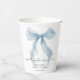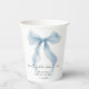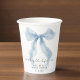 Élégantes tasses en papier pour votre douche de mariage avec une aquarelle d'un ruban bleu fantaisiste, "quelque chose de bleu avant de faire" dans un script de calligraphie chic, et le nom de la mariée et la date de la douche en typographie serif classique.
