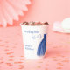 Élégants gobelets en papier sur le thème Something Blue pour la douche de la mariée avec robe bleue et citation de texte en écriture calligraphique.