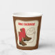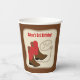 La tasse de papier de fête d'anniversaire de cet enfant présente un thème occidental conçu spécifiquement pour un garçon. L'arrière - plan est brun foncé avec une bordure de corde et est accentué d'une paire de bottes de cowboy rouges. Texte du style de corde : Pari 'yet boot!