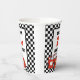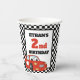 Voiture rouge sur les tasses en papier noir et blanc à damiers drapeau enfant de 2ème anniversaire de fête. Personnalisez avec le nom et l'âge de l'invité d'honneur. Contactez-moi pour obtenir de l'aide sur vos personnalisations ou pour demander des produits Zazzle correspondants ou coordonnés supplémentaires pour votre groupe.