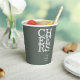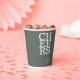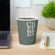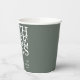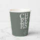 Cet ensemble mariage moderne a une atmosphère chaleureuse et personnelle et de nombreuses pièces présentent un design abstrait et aquarelle ressemblant à des reflets sur l'eau. Cette tasse de papier de coordination a une couleur solide arrière - plan de vert sauge foncé, typographie frappante de 'Cheers' avec vos noms et date mariage. Recherchez ID774 pour voir l'ensemble complet des produits correspondants et des options de couleur supplémentaires pour cette conception.