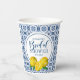 Un joli gobelet en papier pour douche de mariée au citron orné de citrons et de carrelage bleu italien. Parfait pour votre douche de mariée au carrelage bleu italien citron. Conçu pour vous par Blackberry Boulevard.