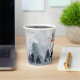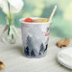 Des tasses en papier à l'aquarelle représentant un renne en silhouette noire se dressent au milieu de quelques pins. Couleur gris noir et blanc neutre.